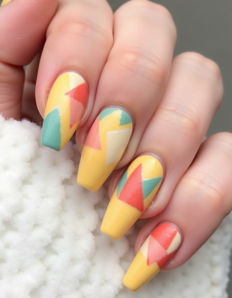 3. Geometric Patterns: Sharp lines and triangles in pastel colors create stunning visual interest on the nails. Pair a soft yellow base with teal and coral accents for a stylish, contemporary look.