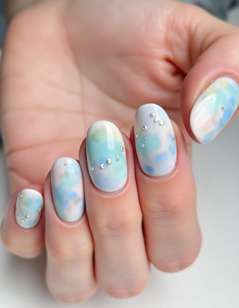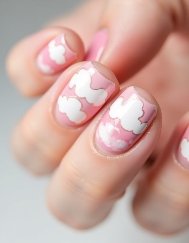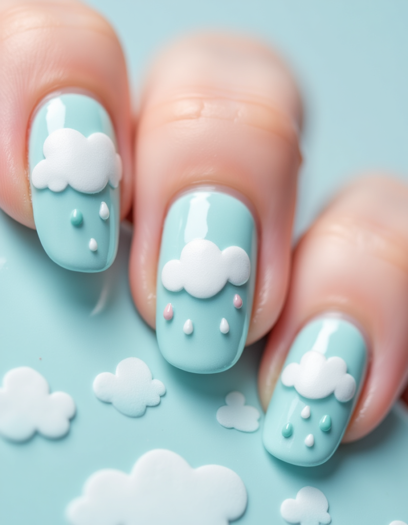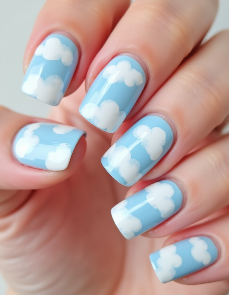 5. Cloud Motif: Light blue and white nail designs depicting fluffy clouds bring joy this season. It resonates with anyone who loves a fun and youthful approach to nail art.
