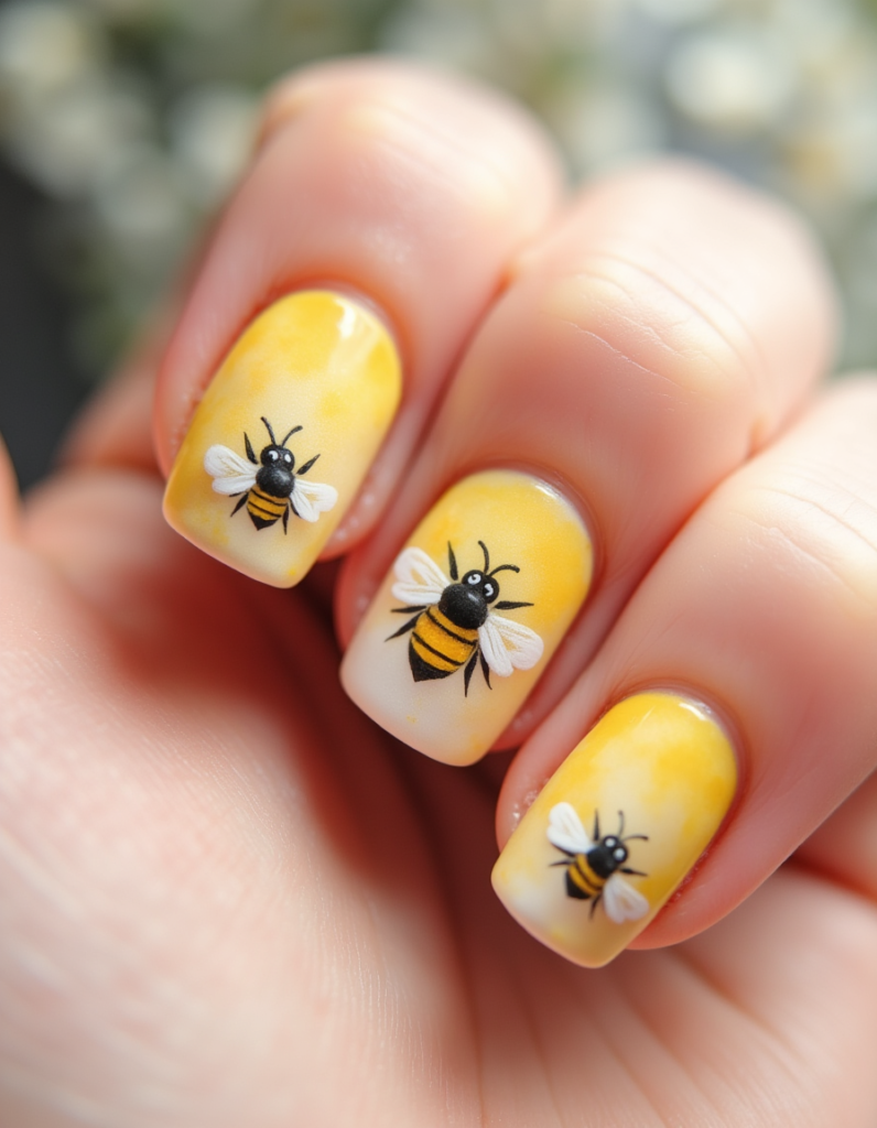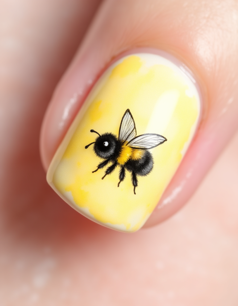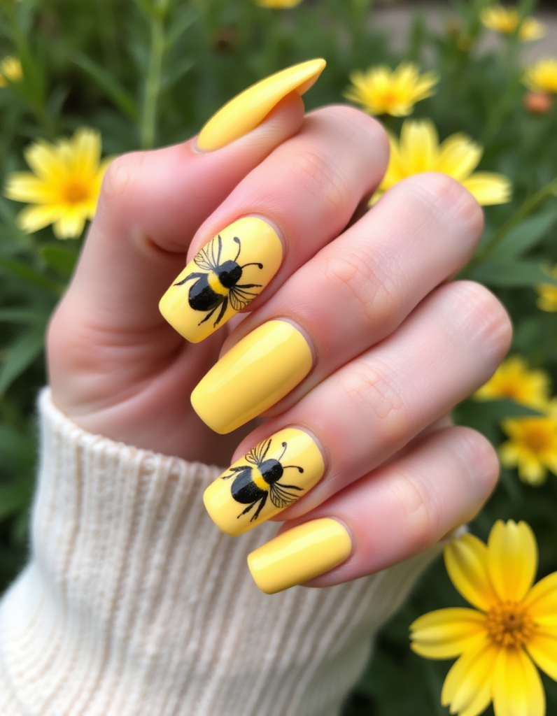 - 7.Bumblebee Accents: Incorporating tiny bumblebee sketches amidst pastel yellow nails creates a delightful nod to spring. This design is perfect for whimsical souls and nature lovers alike.